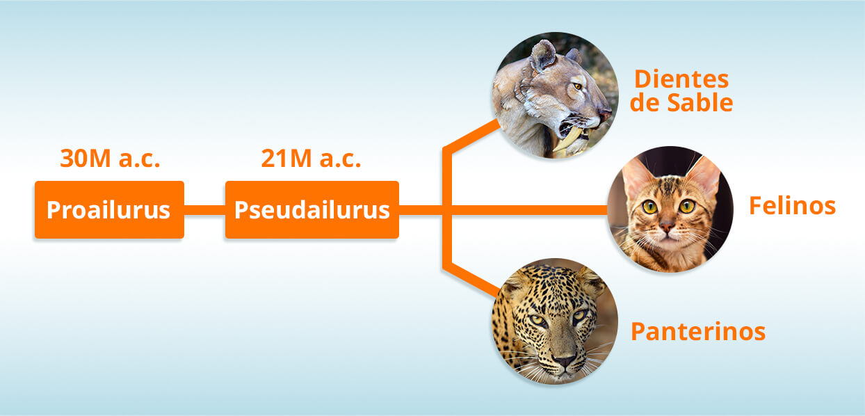 Para conocer cómo llegaron los gatos a nuestros hogares debemos hacer un viaje hacia millones de años al pasado, hasta encontrarnos con los ancestros más antiguos de los gatos: el Proailurus (antes de los gatos) que vivió hace 30 millones de años, y el Pseudailurus (pseudo gato), la especie que originó 3 importantes grupos de gatos: los extintos dientes de sable, los felinos, y los grandes gatos (o panterinos).